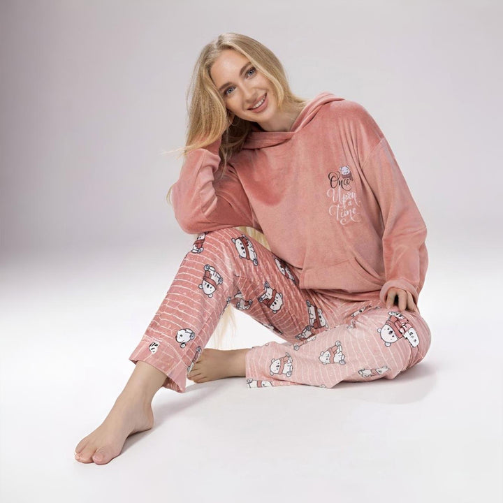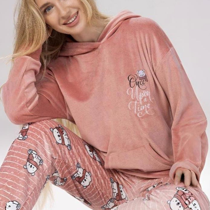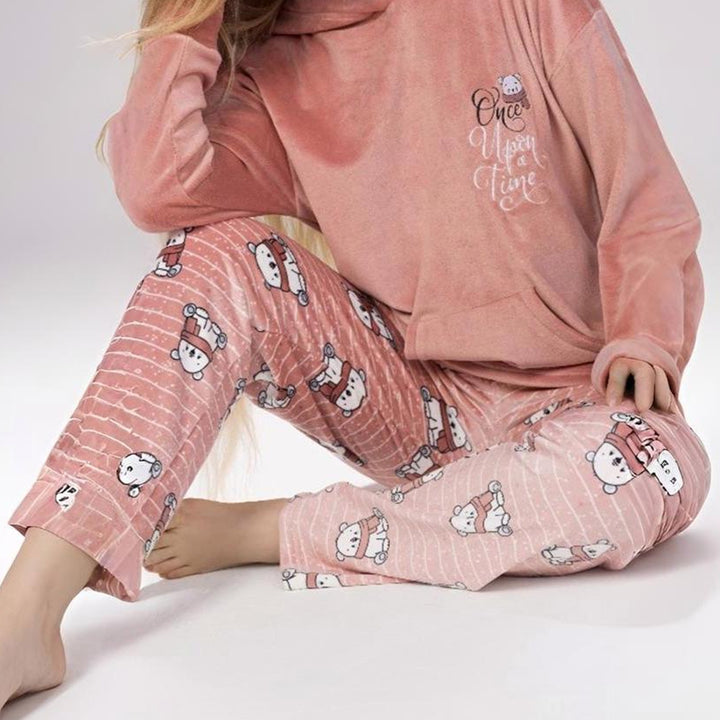 بيجامة بكابيشو أنيق من القطيفة الناعمة، مطرزة بتصميم دبدوب على الصدر يضفي لمسة مرحة ورقيقة.. تجمع بين الراحة والدفء مع إطلالة عصرية مميزة للبيت.
