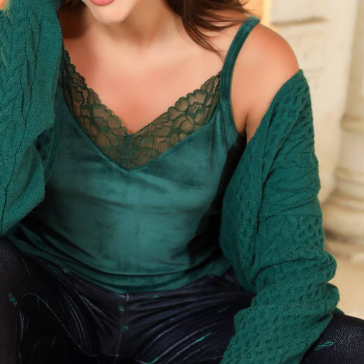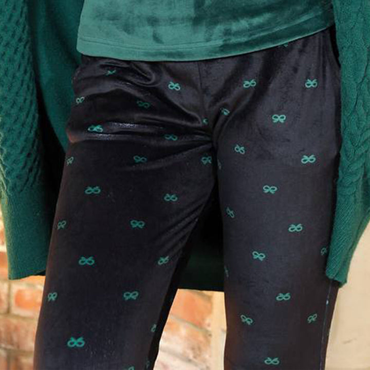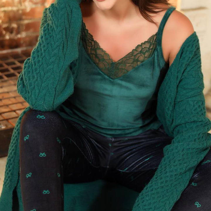 بيجامة تريكو مكونه من 3 قطع بتصميم أنيق يجمع بين النعومة والأنوثة.. بدّي بفتحة سبعة من التُل مع بنطلون مزين بفيونكات رقيقة تضيف لمسة جذابة لإطلالة راقية ومريحة في البيت.