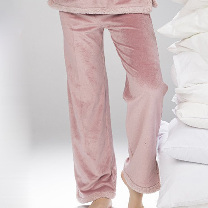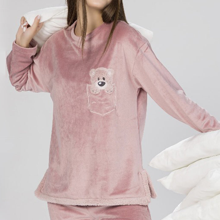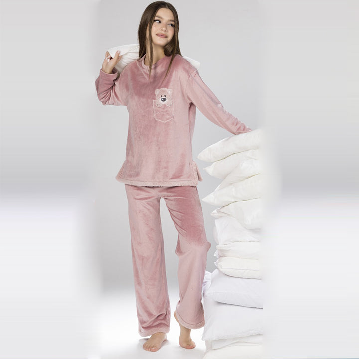 بيجامة قطيفة ناعمة ببنطلون عملي وتصميم مطرز بجيب دبدوب على الصدر يضفي لمسة رقيقة ومرحة.. إطلالة مميزة تجمع بين الراحة والدفء مع تفاصيل أنثوية جذابة.