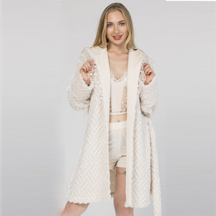 بيجامة قطيفة 3 قطع بتصميم فاخر يشمل شورت عملي وتوب دانتيل أنثوي مع روب بولار دافئ.. إطلالة متكاملة تجمع بين الأناقة والراحة لتمنحك إحساس بالدفء والفخامة في كل تفاصيلها.