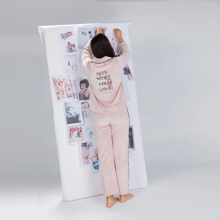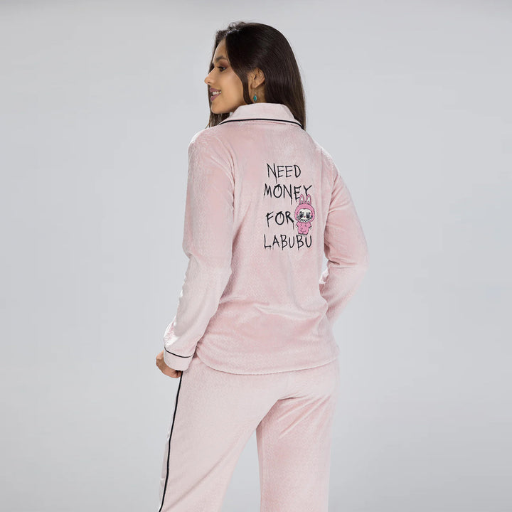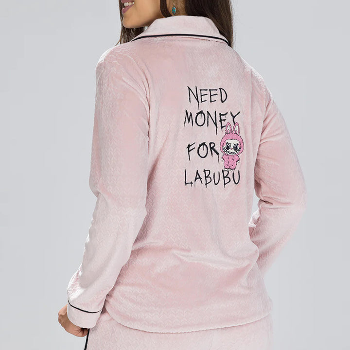 بيجامة قطيفة أنيقة مزودة بأزرار أمامية وتطريز فروع شجر ناعم وعبارة * NEED MONEY FOR LABUBU * يضفي لمسة فخامة وجمال.. خامة قطيفة ناعمة تمنحك دفء وأناقة مثالية لإطلالة راقية في البيت.