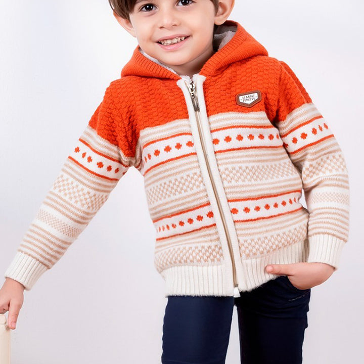 جاكت أولادي أطفال من خامة التريكو المريحة مزود بسوستة أمامية وكابيشو أنيق، مبطن بفرو ناعم لدفء مثالي.. تصميم مقلم بالعرض يمنح طفلك إطلالة عصرية ودافئة تناسب أجواء الشتاء.