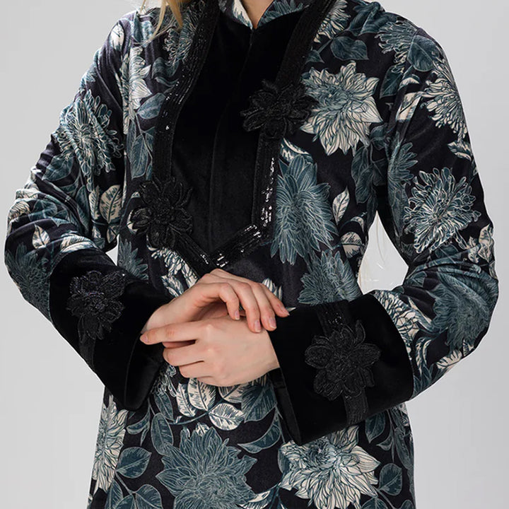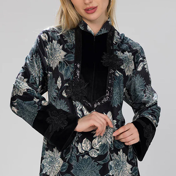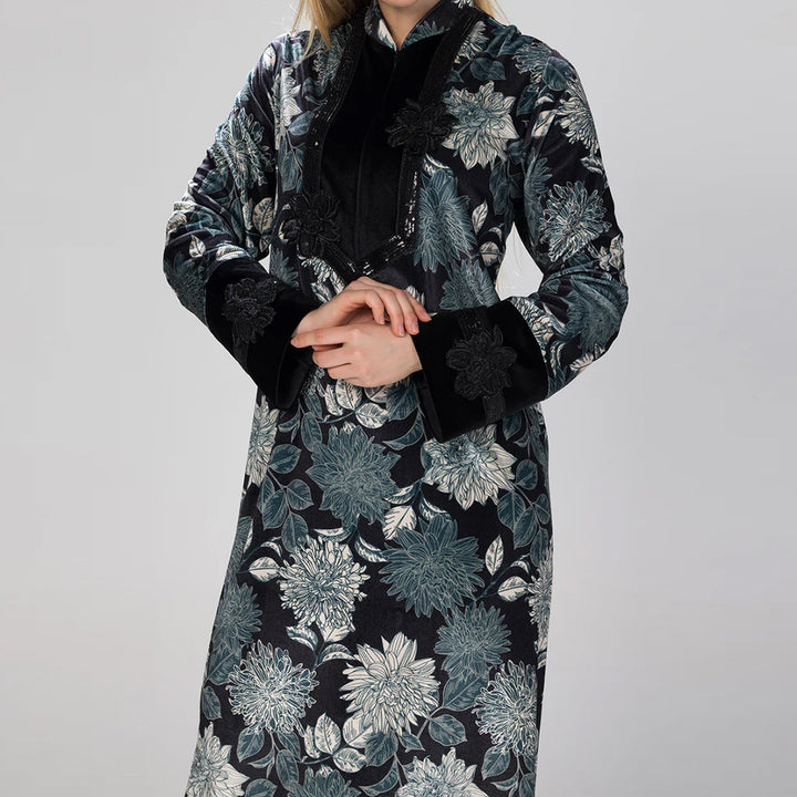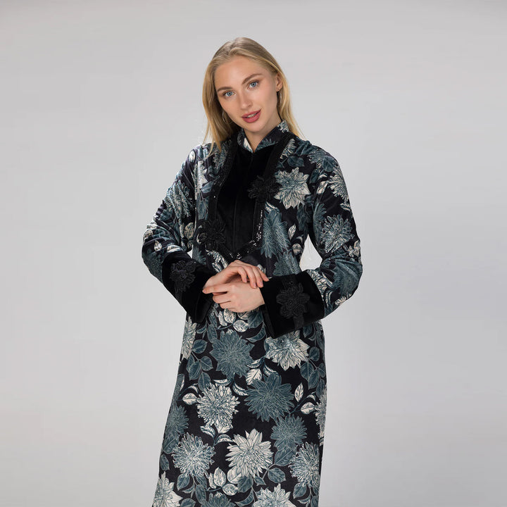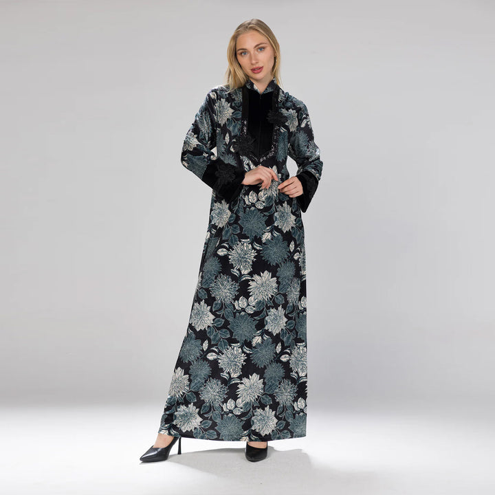 جلباب قطيفة أنيق بسوستة أمامية عملية وتصميم مطبوع بالورود يضفي لمسة أنثوية رقيقة.. خامة قطيفة ناعمة تمنحك دفء وأناقة مثالية لأوقات البيت.