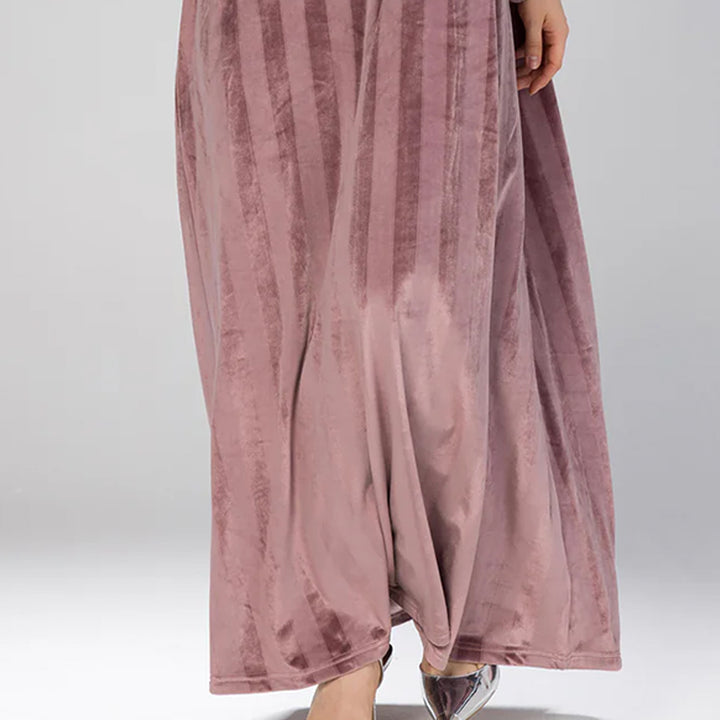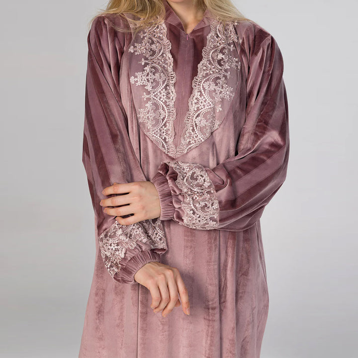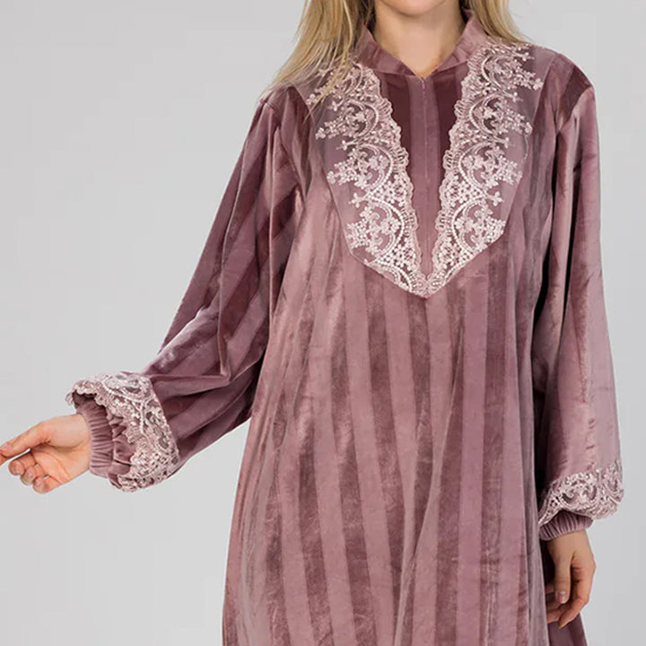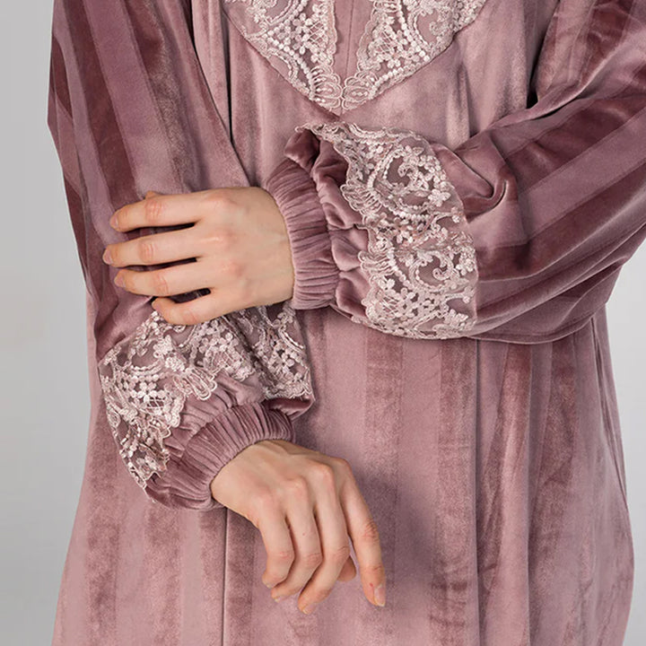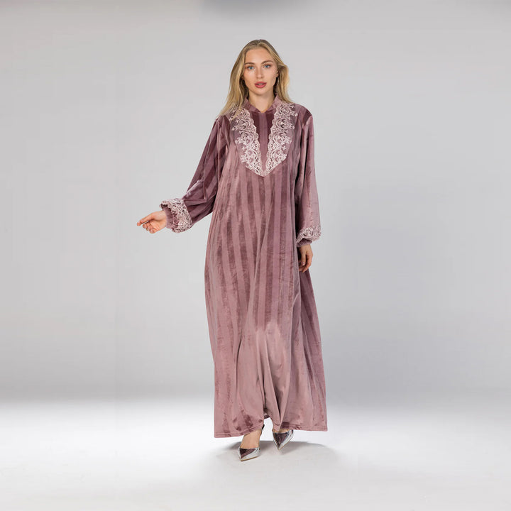جلباب نسائي من القطيفة الناعمة بتصميم مقلم بالطول، مزود بسوستة أمامية على الصدر مع تطعيم جوبير أنيق يضفي لمسة فخامة.