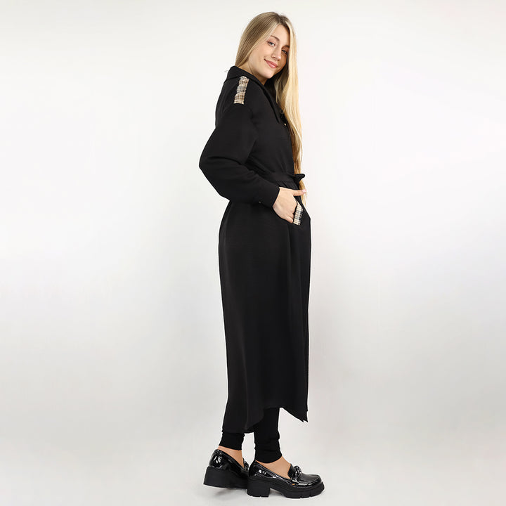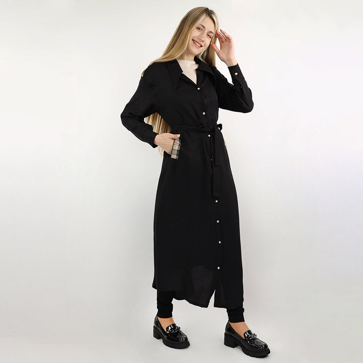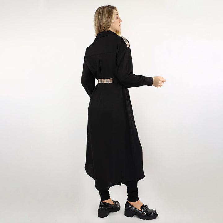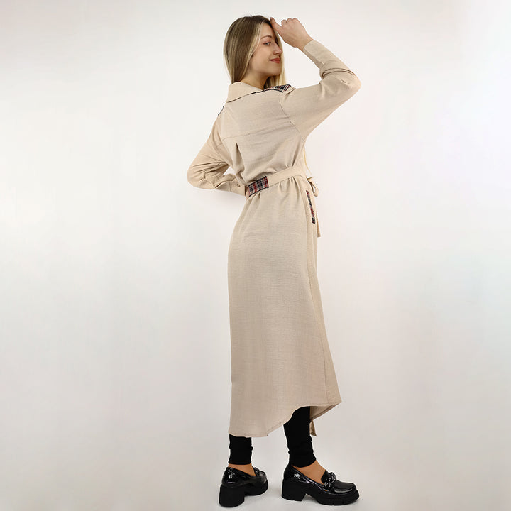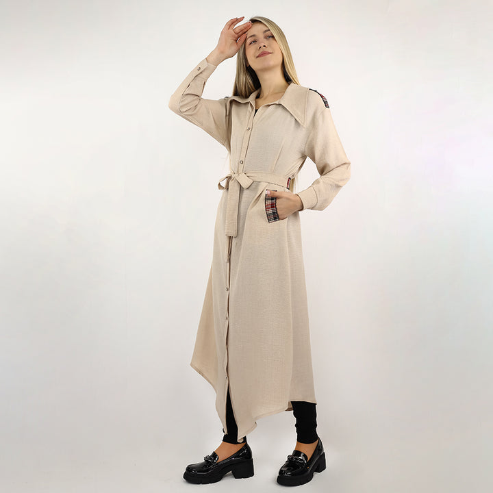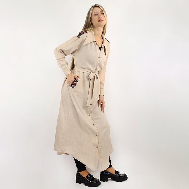 شميز نسائي طويل من الكتان الناعم، بياقة عريضة تضيف لمسة كلاسيكية أنيقة، مع تفاصيل كاروه على الأكتاف والجيوب، وأزرار أمامية وحزام بنفس تصميم الكاروه يبرز القوام.