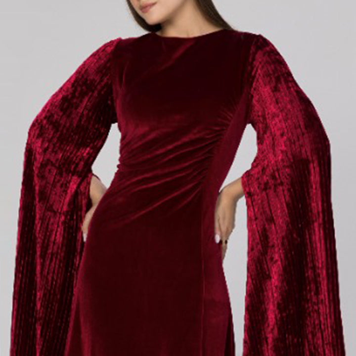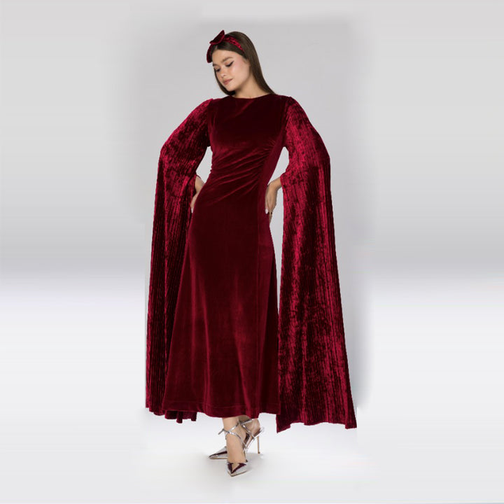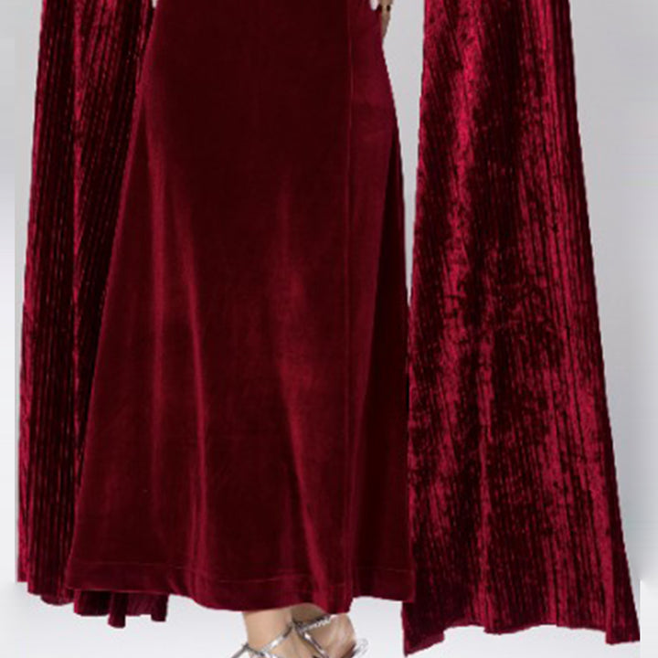 عباية نسائية أنيقة من القطيفة الناعمة، بتصميم بقصّة على الوسط وأكمام إسباني واسعة تضيف لمسة راقية وعصرية.